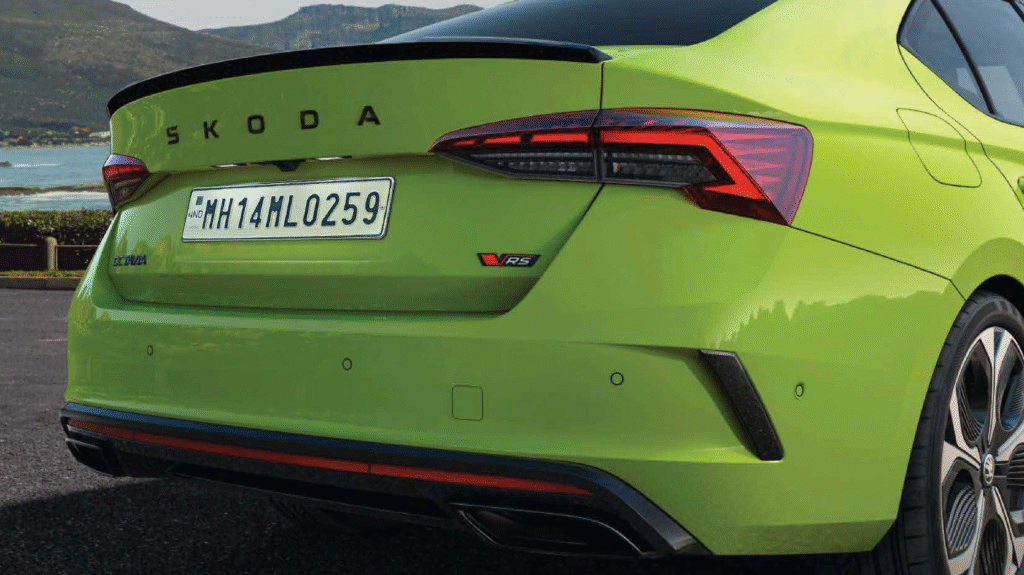 Completing the performance-focused stance are 18-inch alloy wheels, red brake calipers, and a sporty rear spoiler. Additional highlights such as gloss-black ORVMs, sporty bumpers, and twin exhaust tips further emphasize the Octavia RS’s performance-driven DNA and unmistakable RS character.
