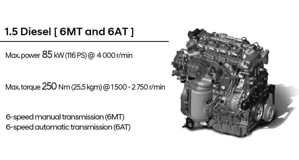 while the 1.5L Diesel is available in 6-speed Torque Convertor and 6-speed manual producing 116PS@4000rpm, 250Nm@2750rpm.